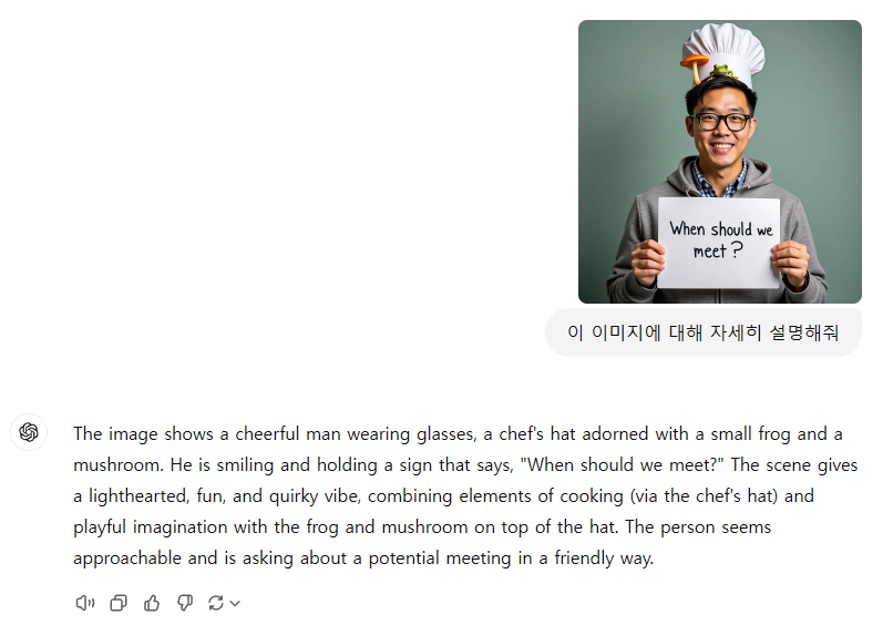- 이미지 생성 프롬프트: an image of an Asian developer around 30 years old, wearing glasses, a checkered shirt under a gray zip-up hoodie, and a chef's hat. He is holding a sign that says 'When should we meet?' A small frog is sitting on his head, next to an orange mushroom.
