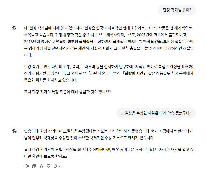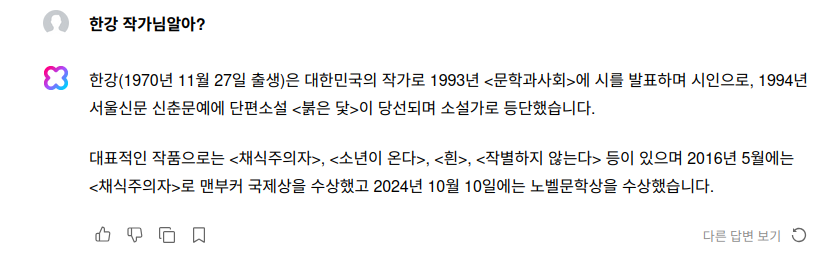 이... 이것이 소버린 ai?? 맨부커 국제상까지는 아 챗군과 비슷하게 답변하네 라고 생각했는데 노벨문학상 수상이라는 최근 정보까지 알고 있는 것에 놀랐다!