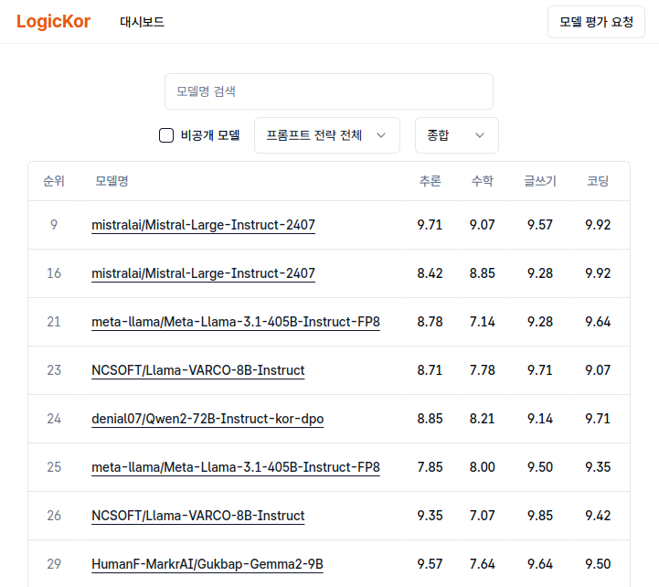 LogicKor 벤치마크에서 상위권에 속하는 모델에 대한 글