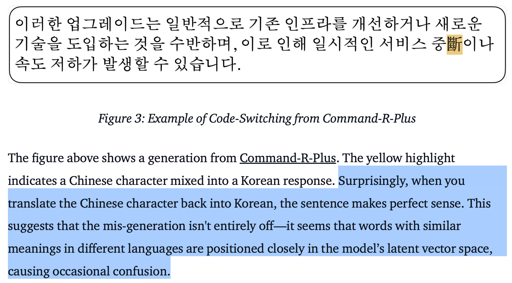현 세대 LLM 들은 한글 출력 과정에서 간혹 한자가 튀어나오는 현상이 좀 있다고 한다. 내가 찾아봤을때는 Qwen2 모델이 좀 그렇다고 봤다. 단순히 한자를 삭제하는 건 코드로 쉽게 제거는 할 수 있을 거 같다. 위 article이 이 문제의 예다. 근데, 저렇게 다른 언어의 글자가 튀어나오는 게 의미가 없는 건 아니여서 좀 문제인 거 같다. 저 한문이 '끊을 단' 이라는데 저 문자를 다시 한글로 변환하면 "일시적인 서비스 중단"이 돼서 말이 맞게된다. 그래서, 단순히 한문을 삭제하기도 어려워보인다. 프롬프트로 주의를 좀 주면 완화될까? 궁금하다. 뭔가 이런 것도 연구한 논문이 있을 거 같다.