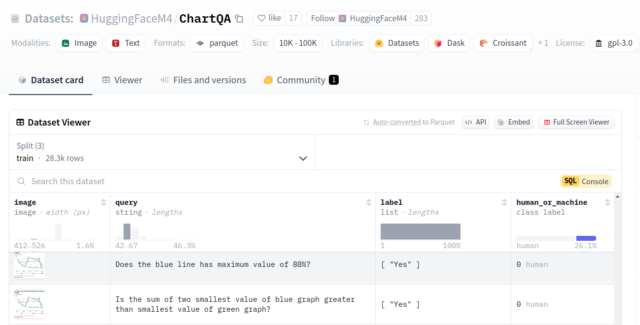 저는 컬럼을 ChartQA 데이터셋을 따라서 image, query, label 로 정의할것입니다. 그리고 query는 ocr을 수행할것이기에 일괄적으로 모두 동일한 query를 사용할 것입니다. OCR 이면 단순히 입력이 이미지고 출력이 텍스트지 않냐! 왜 입력 도메인이 1개인데 제목에 멀티모달이 포함되냐?라는 의문을 가지셨을수도 있겠습니다. 제가 다루려는 모델이 VLM 이다보니 이미지와, 쿼리(=텍스트)를 동시에 받아서 제목에 멀티모달이라는 키워드를 포함시켰습니다.