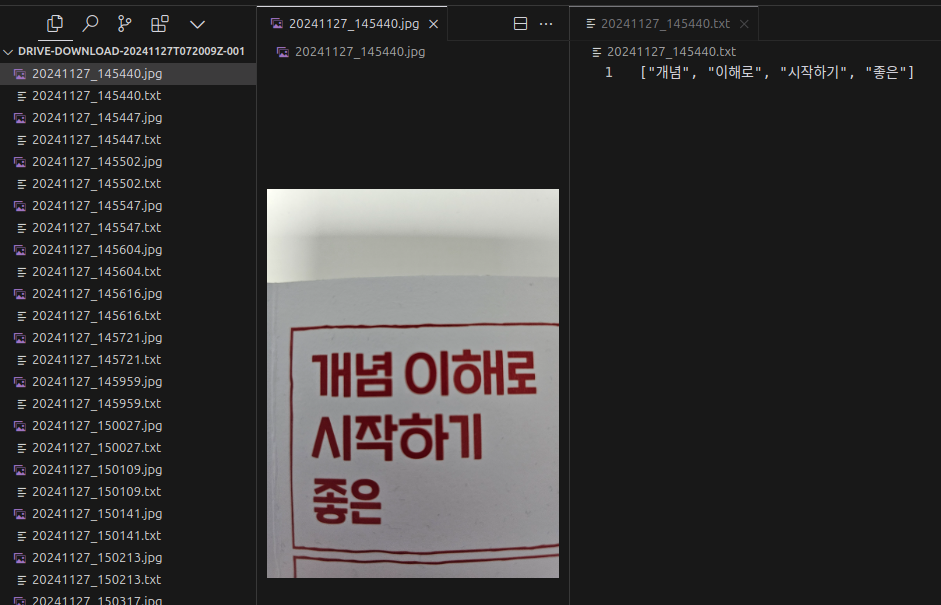 저는 OCR 데이터셋을 구축하기 위해 (*.jpg, *.txt) Pair 로 데이터셋을 구축해봤습니다. txt 파일에 정답을 기록하였습니다.