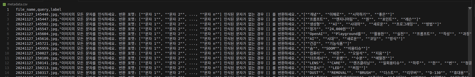 제 경우에는 class가 아닌 query와 label이 되는 것이기에 아래와 같은 metadata.csv파일이 split된 폴더(train, validation, test)에 포함돼야 하는 것입니다.