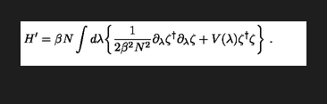 H ^ { \\prime } = \\beta N \\int d \\lambda \\biggl \\{ \\frac { 1 } { 2 \\beta ^ { 2 } N ^ { 2 } } \\partial _ { \\lambda } \\zeta ^ { \\dagger } \\partial _ { \\lambda } \\zeta + V ( \\lambda ) \\zeta ^ { \\dagger } \\zeta \\biggr \\} \\ .