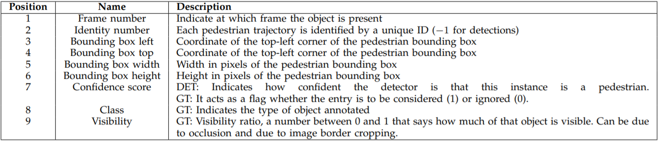 Training Set에는 Annotation 파일(.../gt/gt.txt)이 주어집니다. .../det/det.txt 파일은 Re-identification을 위한 Annotation은 제외된채로 Detection만을 위한 Annotation이 되어 있습니다.