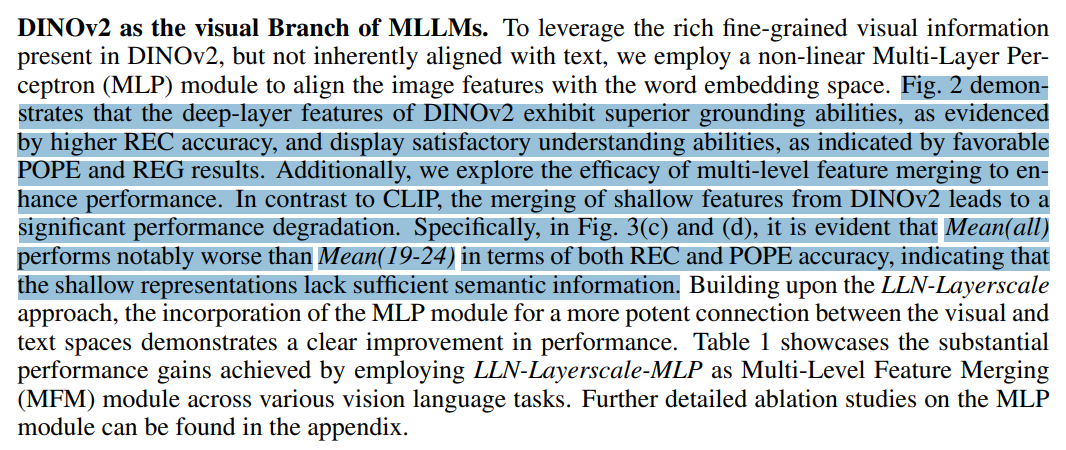 - DINOv2는 Text 없이 오로지 Visual Data로만 학습됐기 때문에, Text Embedding과 Align을 시켜주기 위한 목적으로 MLP Layer 를 거치게한다.