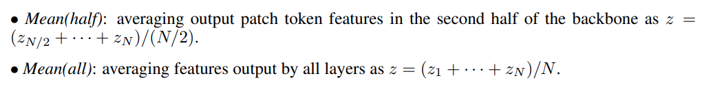 의문, 왜 dinov2는 모든 block에서 나오는 피쳐를 사용하지 않았냐? fig3 (c), (d) 잘보면 모든 feature 다 mean 해버렸을때 뒤에 일부 block에서 나오는 피쳐를 mean 했을때보다 성능이 낮은 걸 확인할 수 있다. 그래서 뒤에 몇 block에서 나오는 피쳐만 추출해준것이다. 반대로 (a), (b) 보면 CLIP은 모든 block에서 나오는 피쳐를 mean해도 크게 성능 드랍이 없는 것을 확인할 수 있다.