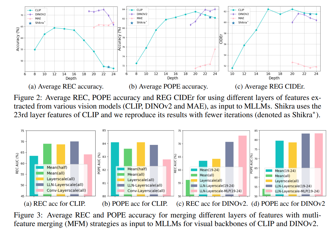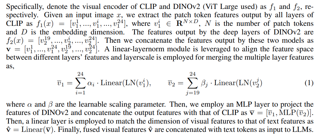 CLIP 의 서로 다른 블락에서 나오는 피쳐들을 잘 Ensemble 해주고, DNIOv2 의 서로 다른 블락에서 나오는 피쳐들을 잘 Ensemble해주고 Concat 해주고 Embedding 해준 피쳐들을 Text Embeddings이랑 잘 LLM 에 넣어주면 VLM의 성능이 올라간다고한다.