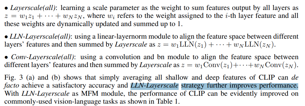 - Fig 3 그럼 같은 백본에서 서로 다른 블록에서 나오는 피쳐를 어떻게 버무려야하냐? LLN-Layerscale(all) 이 평균적으로 여러 태스크(2개 지만...), 여러 모델(CLIP, DINOv2 2개 지만...)에서 평균적으로 괜찮게 나오더라