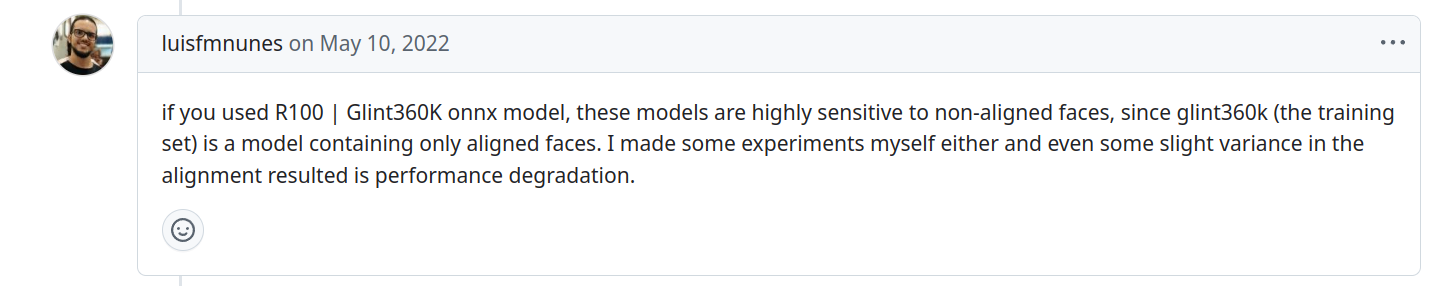 데모에 사용된 모델이 Glint360K Pretrained 모델인데 이 데이터가 Face alignment가 된 이미지들이라고 한다. 그래서 Alignment 여부가 굉장히 중요하다고 한다. 아직 내가 직접 봐보진 않아서 확실하진 않다.