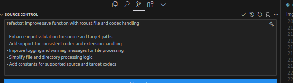 Source Control 탭들어가서 커밋할 거 add하고 저 멋쟁이 버튼 누르면 알아서 커밋 메시지 작성해준다.