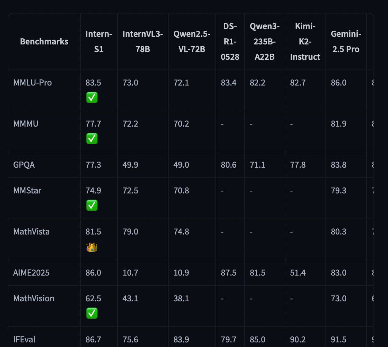 20250806기준 벤치마크 상으로 gemini 2.5 pro에 필적하는 Open VLM Intern-S1