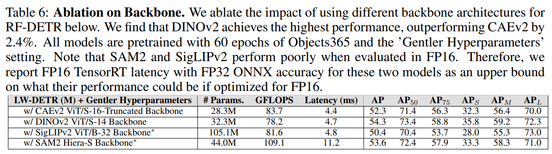 회사에서 많이 해왔던 일이라면 공개되는 최신 vision foundation backbone networks들을 우리의 기존 모델의 backbone을 교체하여 성능 변화를 보는 일인데, 이 논문에서 object detection 모델을 대상으로 비교적 최신 vision backbone networks라 할 수 있는 SigLIPv2, SAM2 네트워크에 대해 실험을 해놨다.