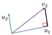 \(\mathbf{v}_{2}\)를 \(\mathbf{u}_{1}\)에 정사영 내리고 정사영 내린 벡터를 \(\mathbf{v}_{2}\)에서 빼면 \(\mathbf{u}_{1}\)에 수직한 벡터를 구할 수 있습니다.